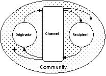 Figure 2 extends Figure 1 to show list server discourse as a cycle of origination and response between participants that is shared with a community through a computer-mediated channel. The community involvement leads to more complex discourse patterns in that: the originator may not direct the message to a particular recipient; there may be multiple responses to a message; and the response from the recipient may itself trigger responses from others who did not originate the discourse. For a particular discourse sequence this leads to a natural division of the community into active participants who respond and passive participants who do not.