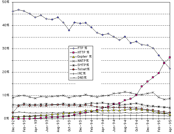 Figure 2 Proportion of FTP, web (HTTP), Gopher, News (NNTP), Mail (SMTP), Telnet, IRC and DNS traffic on the NSFNET backbone 1992-1995
