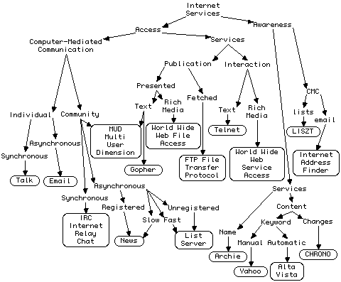 This article has distinguished the major services on the net in terms of dimensions of utility such as: resource access or awareness; access to computer-mediated communication or services; synchronous or asynchronous communication; support of text or rich media; search by name or by content; and so on.