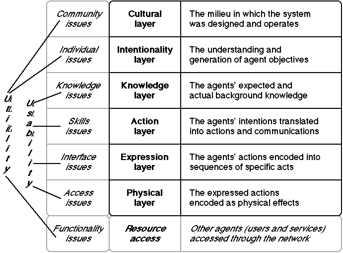 Multiple 6 layer models of users and 3 layer models of services may be combined to provide a model of a complex system in which users communicate with other users and services through a network at the physical layer, establishing ‘virtual circuits’ at the upper layers (Gaines, 1988). This is shown as "resource access" at the bottom of Figure 4 which subsumes the functionality that the agent can access through the network.