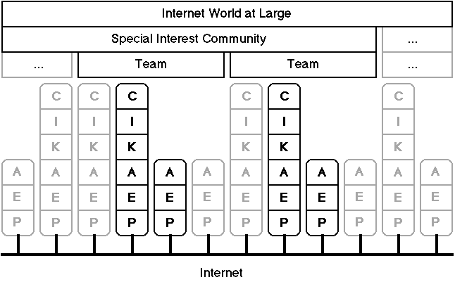 The human factors framework for the net and web as outlined in Section 1 can be analyzed in greater depth by using the layered protocol models which have been developed to provide a conceptual framework for complex systems of people and computing services (Gaines, 1988). Figure 4 shows a 6 layer model that partitions each sub-system, person or computing service, into: