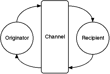 Note that agent processing times and channel delays have been lumped. A study focusing on the impact of communication delays would want to consider them separately, otherwise there is no significant distinction–a general principle might be that communication delays should not be greater than agent processing times. Note also that the diagram is to a large extent symmetrical–the recipient becomes an originator when responding.