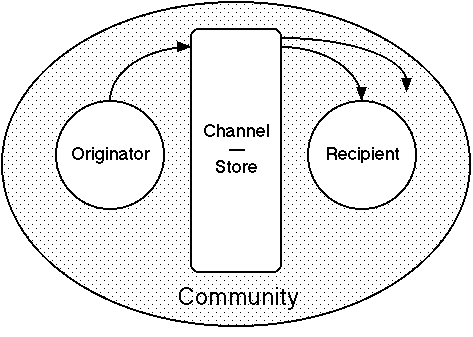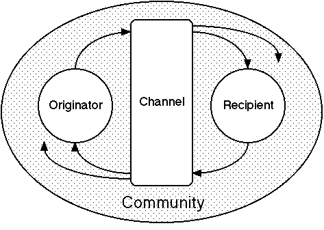 Figure 9 extends Figure 8 to show list server discourse as a cycle of origination and response between agents that is shared with a community through a computer-mediated channel. The community involvement leads to more complex discourse patterns in that: the originator may not direct the message to a particular recipient; there may be multiple responses to a message; and the response from the recipient may itself trigger responses from others who did not originate the discourse. For a particular discourse sequence this leads to a natural division of the community into active participants who respond and passive participants who do not.