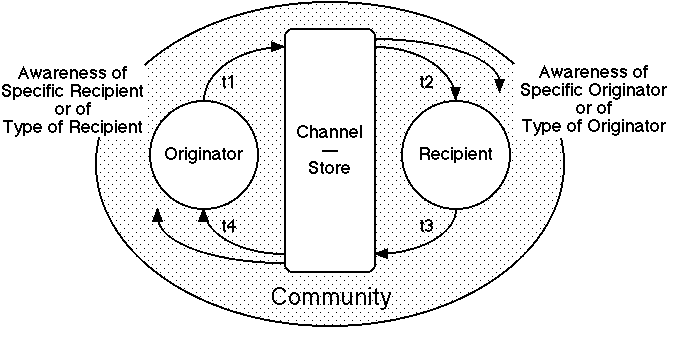 Figure 11 subsumes Figures 8 through 10 to provide an integrated model of the temporal structure of Internet communication processes that captures all the issues discussed. It models the processes as discourse punctuated by the intervention of a store allowing an indefinite time delay between the emission of a message and its receipt. It introduces two major dimensions of analysis: the times for each step in a discourse cycle; and the awareness by originators of recipients and vice versa.