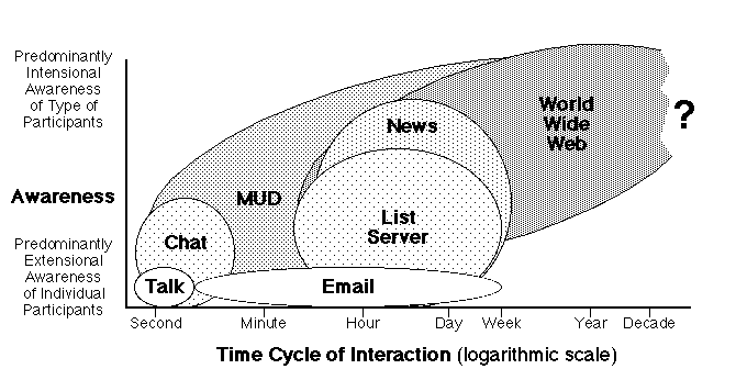 List servers and news groups operate on time cycles of hours to days and involve extensional awareness of only a few participants but reasonably strong intensional awareness of the type of participant. The web operates on even longer time scales from a day up to years and generally involves little extensional awareness of participants–readers may know particular authors, but writers generally do not know their readers. The question mark indicates that the web has been operating for such a short period that any long term estimates of its impact as a publication medium are speculative projections.