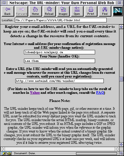URL-minder is a centralized system that keeps track of resources on the web and sends registered users e-mail whenever their personally registered resources change. Web users can have the URL-minder keep track of any web resource accessible via HTTP. It can be anything -- not just web pages users personally maintain (Figure 3).