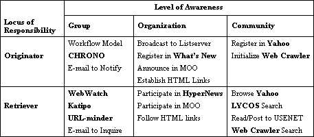 At the group level, originators of the information resource can organize and implement work flow models of the group activities, use server-side chronological awareness support systems such as CHRONO, or/and send e-mail notification to users of information. Retrievers of the group level information resource can use client-side chronological awareness tools such as WebWatch and Katipo or register in centralized dispatcher service like URL-minder. Alternatively, they can send e-mail to inquire to information originators to see if any new things have come up.