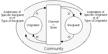 Figure 5 subsumes Figure 2 through Figure 4 to provide an integrated model of Internet knowledge processes that captures all the issues discussed. It models the processes as discourse punctuated by the intervention of a store allowing an indefinite time delay between the emission of a message and its receipt. It introduces two major dimensions of analysis: the times for each step in a discourse cycle; and the awareness by originators of recipients and vice versa.