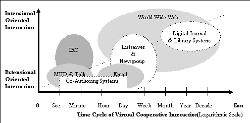 Large scale groupware differs not only in the quantity, but also in the quality of cooperative interaction (Dennis, Valacich & Nunamaker, 1990). The fundamental nature of interaction on the web can be characterized as virtual cooperative interaction. The word "virtual" has two senses here: first, it denotes the notion of virtual space, i.e., the cooperative interaction occurs in a non-physical space which allows participants to be situated in geographically separate locations; second, it denotes that the intention to engage in cooperative interaction itself may not necessary pre-exist or be conscious. Traditional notions of groupware focus on the first sense (tele-presence in virtual space), but there is a need to extend the notion of cooperative interaction to encompass the latter sense of virtual cooperative interaction also.