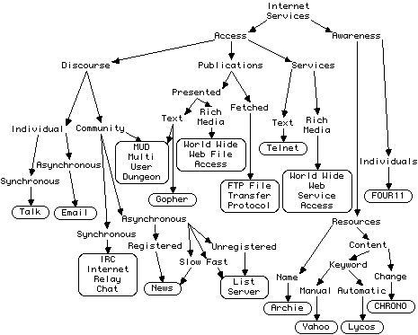 The less well-know systems classified are FOUR11 which provides an index of email addresses, and CHRONO (Chen, 1995) which indexes a web site in reverse chronological order to provide an automatic "what's new" page. MUDs, multi-user dungeons/dimensions, are interesting in providing a mix of services supporting both discourse and resource access. Web browsers such as Netscape are interesting in providing a single tool accessing nearly all the services shown except talk and chat.