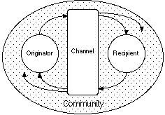 Figure 3 extends Figure 2 to show list server discourse as a cycle of origination and response between agents that is shared with a community through a computer-mediated channel. The community involvement leads to more complex discourse patterns in that: the originator may not direct the message to a particular recipient; there may be multiple responses to a message; and the response from the recipient may itself trigger responses from others who did not originate the discourse. For a particular discourse sequence this leads to a natural division of the community into active participants who respond and passive participants who do not.