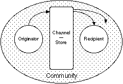 Figure 4 modifies Figure 3 to show web publication as an activity in which the channel is buffered to act as a store also. The material published is available to a community and the originator is unlikely to target it on a particular recipient. Recipients are not expected to respond direct to the originator, but responses may occur through email, list servers or through the publication of material linked to the original. Because the published material is not automatically distributed to a list, recipients have to actively search for and discover the material.