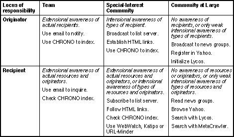 The differentiation of communities in terms of awareness draws attention to the significance of supporting various aspects of awareness in a CMC system. Resource awareness, the awareness that specific resources or resources with specified characteristics exists, may be supported by various indexing and search procedures. However, there is also a need to support chronological awareness, the awareness that a resource has changed or come into existence. Figure 6 also shows the way in which current tools for awareness support are classified within this framework.