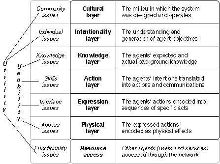The action and expression layers are separated to allow actions to be conceptualized both as unitary abstractions and as the particular expression of those abstractions as a sequence of acts. For example auto-dialing may be conceived as a single psychological entity even though it may be expressed by a menu selection, dialog box click or command line text entry. The term `agent' is used to cover both human users and computer services. At the current state of the art, the top three layers are design time considerations in developing computer services and only the three low levels are operational at run time, although the development of `knowledgeable agents' as a computer technology is a major research area.