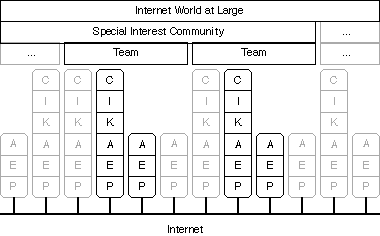 The cultural layer at the top of Figure 1 itself requires partitioning when one considers the different forms of community supported through CMC. It is already been noted that at least three types of community need to be distinguished: the highly-coordinated, goal-directed teams; the more loosely coordinated special-interest communities, such as professional sub-disciplines; and the largely uncoordinated Internet world at large whose members have in common only the use of CMC. Figure 2 shows the layered protocol model extended to groups of agents grouped as specified.