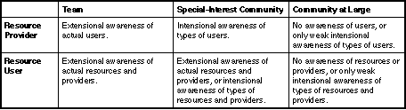 In a special interest community resource providers usually do not have such extensional awareness of the resource users, and, if they do, can be regarded as forming teams operating within the community. Instead, resource providers usually have an intensional awareness of the resource users in terms of their characteristics as types of user within the community. The classification of users into types usually corresponds to social norms within the community, such as the ethical responsibilities in a professional community to communicate certain forms of information to appropriate members of the community. Resource users in a special interest community may have an extensional awareness of particular resources or resource providers, or an intensional awareness of the types of resource provider likely to provide the resources they require. This asymmetry between providers and users characterizes a special interest community and also leads to differentiation of the community in terms of core members of whom many users are extensionally aware, and sub-communities specializing in particular forms of resource.