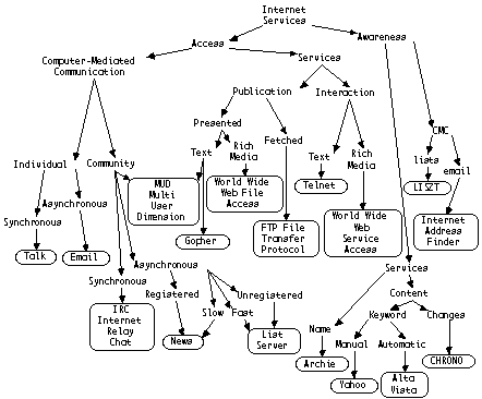 In examining the utility of the net and web it is useful to classify all the major services in terms of the significant distinctions that determine their relative utilities as shown in Figure 4. It characterizes the major net services in terms of their utility for CMC, resource access or search. It sub-classifies CMC in terms of whether it is individual-to-individual discourse or community discourse; synchronous with the participants conversing in real time or asynchronous with substantial time delays in responses. It sub-classifies asynchronous community discourse by whether the channel is slow or fast, and whether the community is centrally registered or not. It sub-classifies resource access in terms of whether it is: a static resource or an interactive service; just fetched or presented when fetched; text or rich media. It sub-classifies search by whether it is: by resource name or content; by keywords or by change in contents; and whether the keywords are generated manually or automatically.