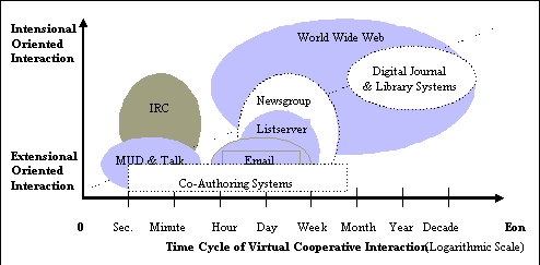 Many groupware systems have been designed to support collaborative teams in which interactions are between known group members. In contrast, interactions in USENET news groups involve both extensional and intensional awareness of targeted audience. For example, one can respond to a question from a specific individual (an extensional oriented interaction) but do so publicly with the intention to address others who may have a similar question in mind (intensional oriented interaction). The relationship between the time-cycle and the relative strength of extensional/intensional awareness in the learning web can be illustrated in a time-dimension diagram (Figure 5). If the time-cycle is relative short, say in few seconds or minutes, we have an interaction that can be characterized as synchronous (real-time). If it is longer, we have interaction that is often described as asynchronous (delay-time). The key notion here is that the types of virtual cooperative interactions are differentiated on a temporal continuum rather than by discrete categories.
