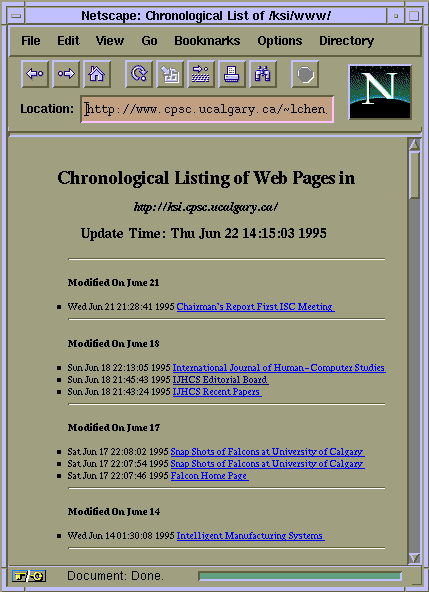 The user interface of the CHRONO system is fairly straightforward and intuitive for web users. It looks like an automated what's new page to the users. From the list, the visitors will be able to tell at a glance what documents have been modified or created recently. They can also scroll down the list to check those older documents at the site. Because the titles of the listed pages also act as hyperlinks to the actual web pages, the visitors can simply click on them and jump to the relevant pages of interests.